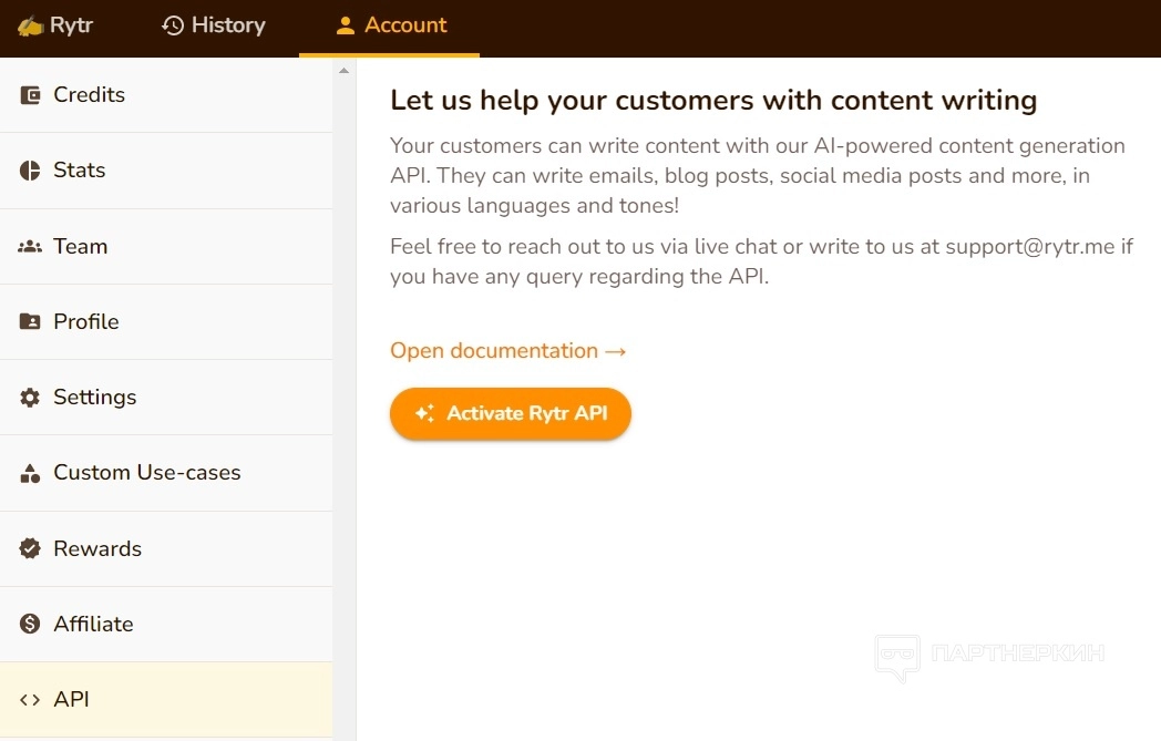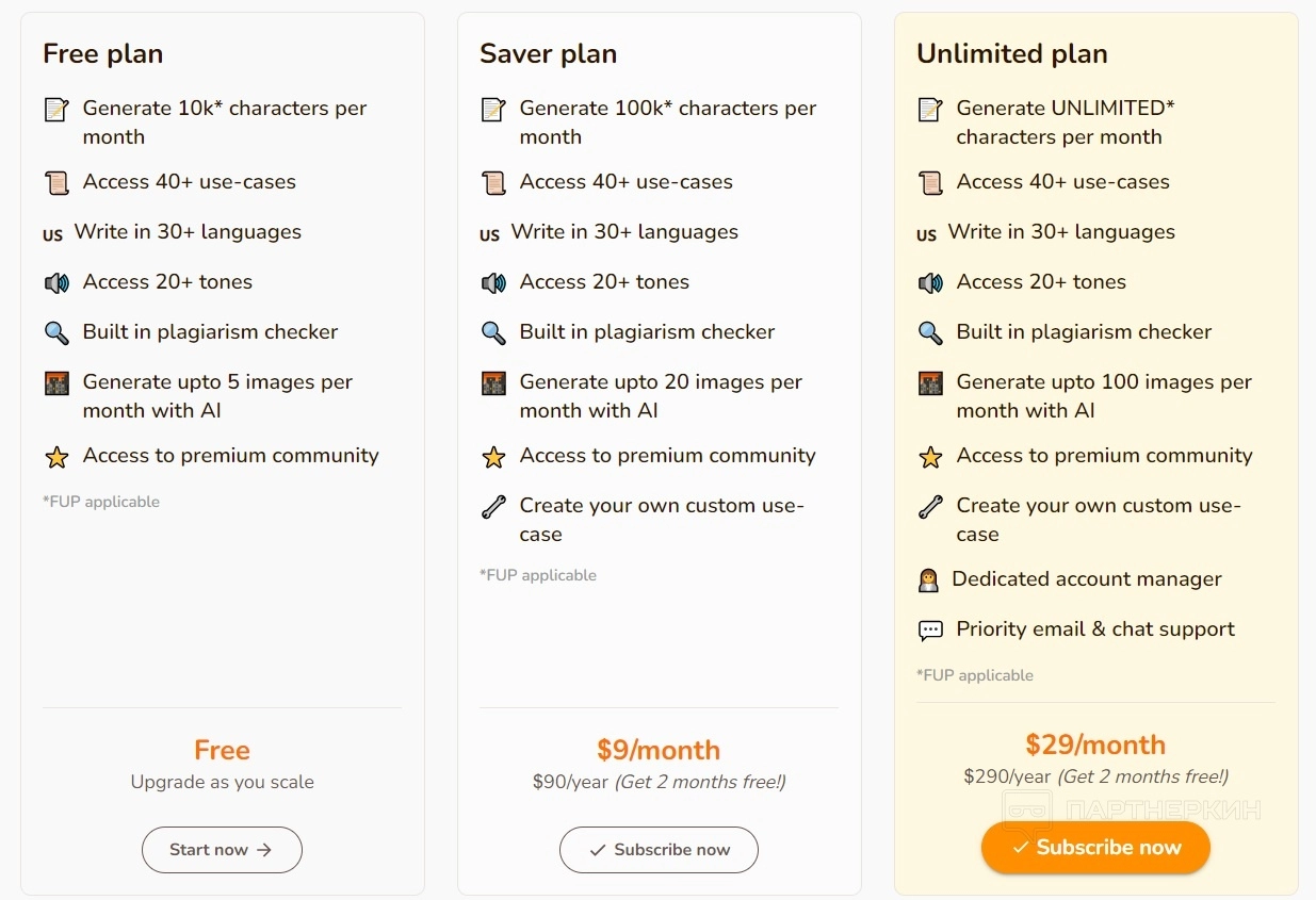 На тарифе за $29 в месяц нет ограничений по количеству символов, можно генерировать до 100 изображений, создавать свой собственный вариант использования, предоставляется выделенный аккаунт-менеджер, приоритетная поддержка в почте и чате. Для оплаты используется платежная система Stripe.