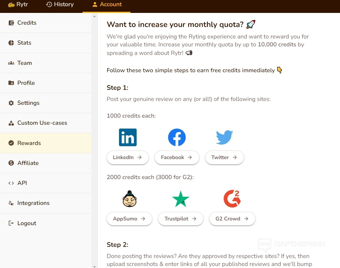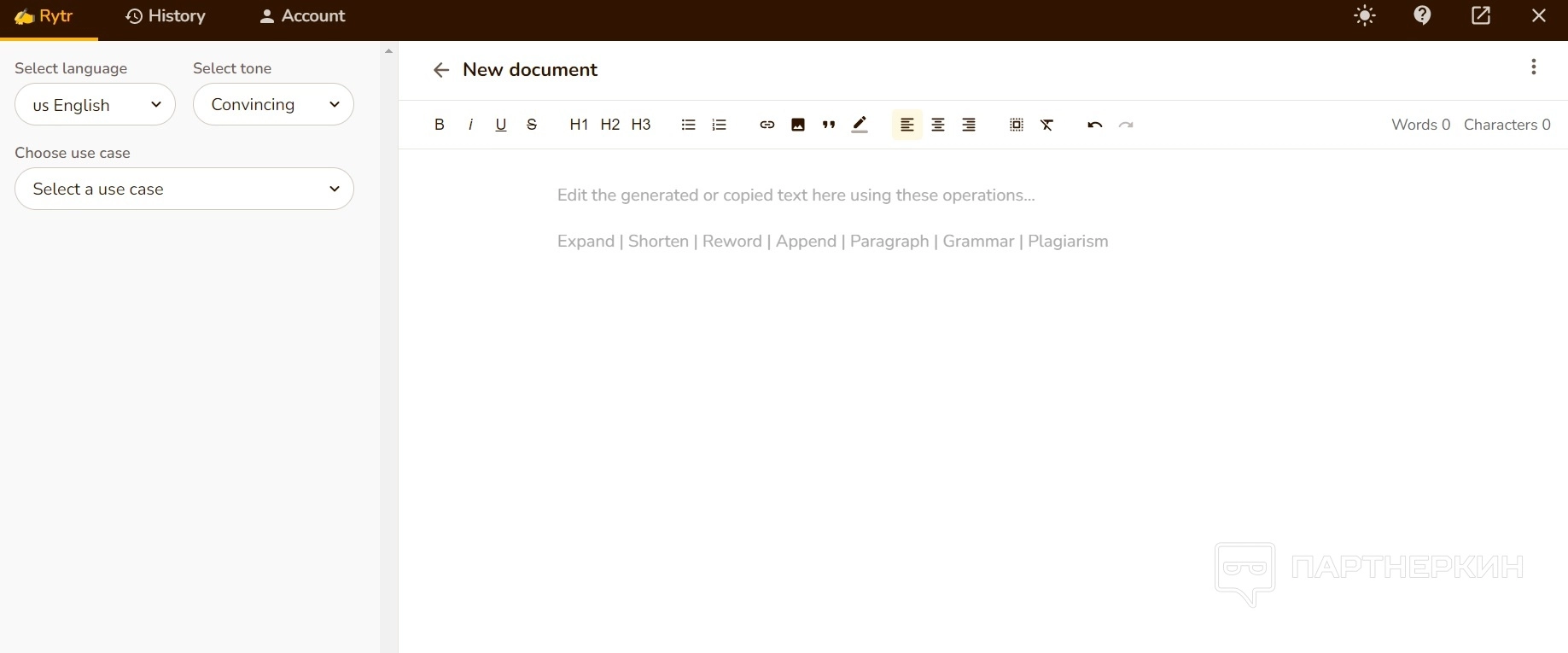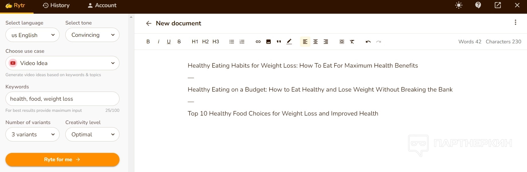 Rytrобеспечивает быструю навигацию, поиск выходных данных в разделе «История», возможность сослаться на предыдущую работу. Готовые и отформатированные тексты можно скачать в формате docx или html.
