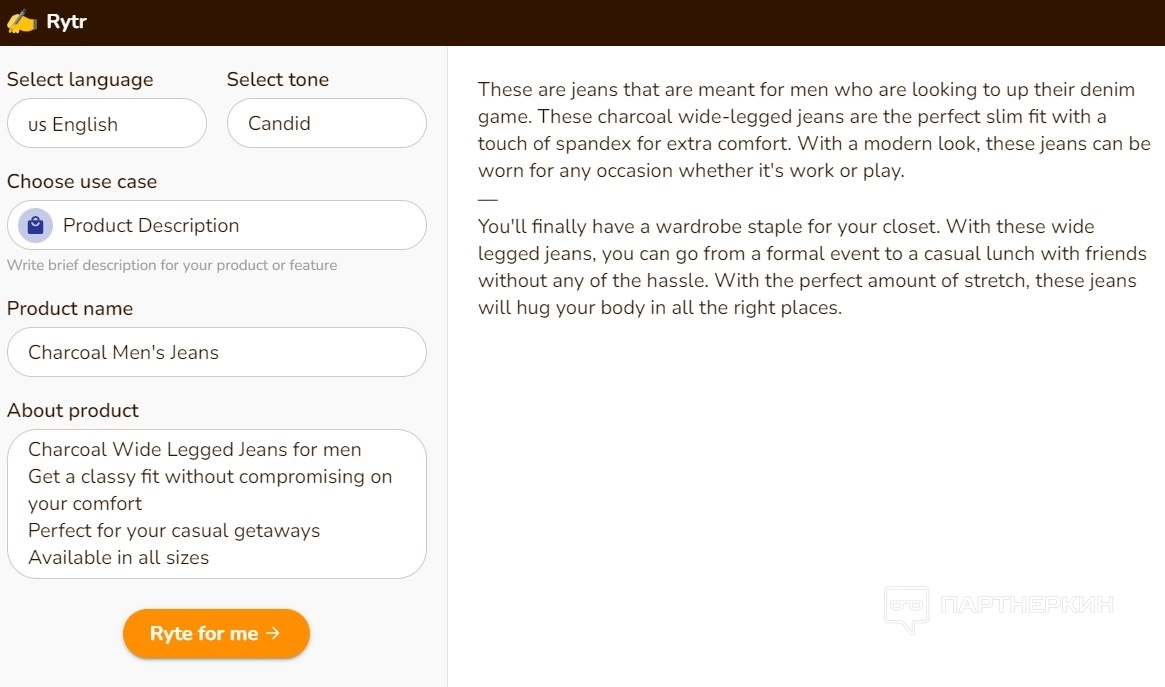 - Описание продукта. Rytr позволяет создать убедительные описания продуктов, чтобы повысить вовлеченность клиентов и конверсию интернет-магазина.