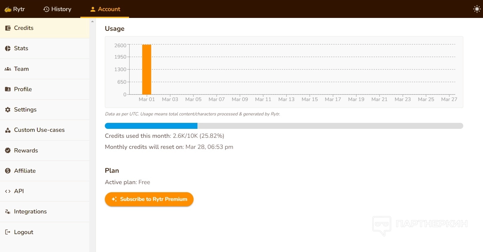 Кредиты — это количество использованных символов, которые пользователь создал и обработал за месяц. В своей учетной записи клиент может видеть текущий план, подписаться на премиальное предложение для неограниченного количества символов в месяц.