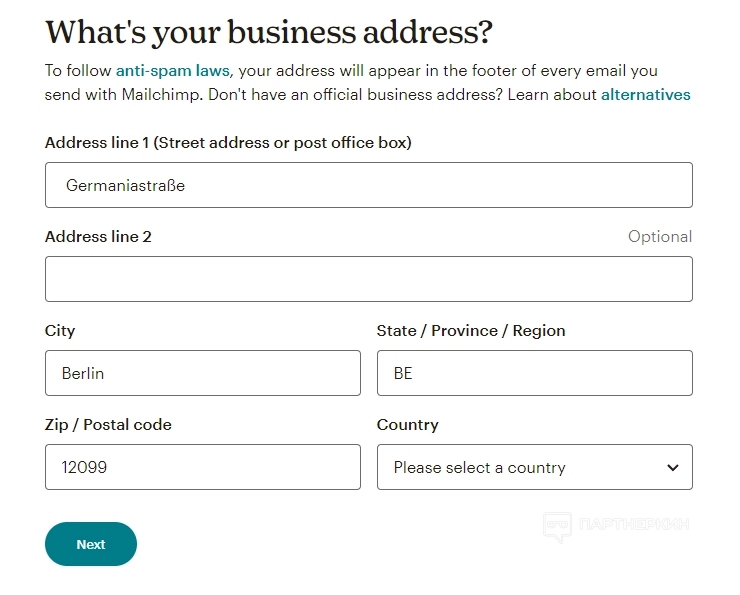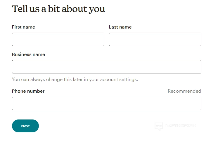 После регистрации сервис Mailchimp попросит пользователя предоставить больше персональной информации. На первой странице нужно заполнить следующие поля:
