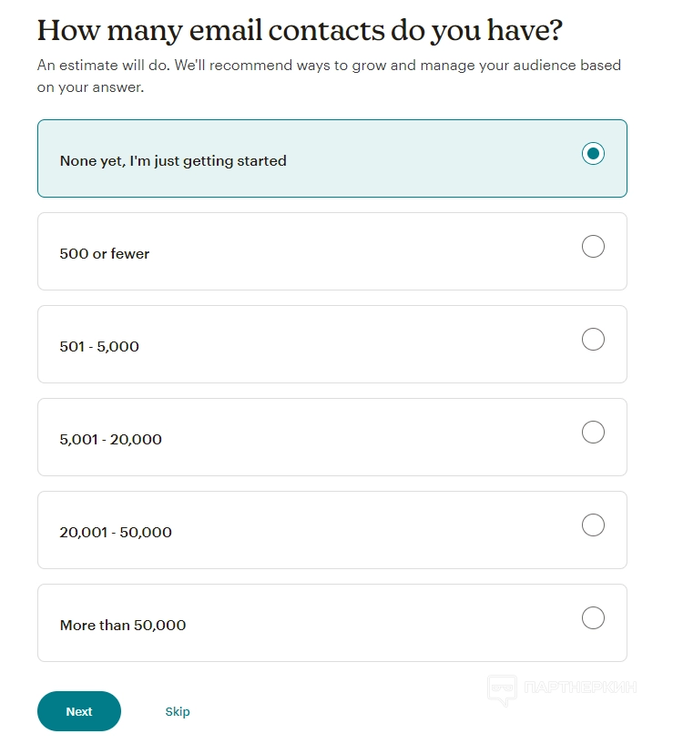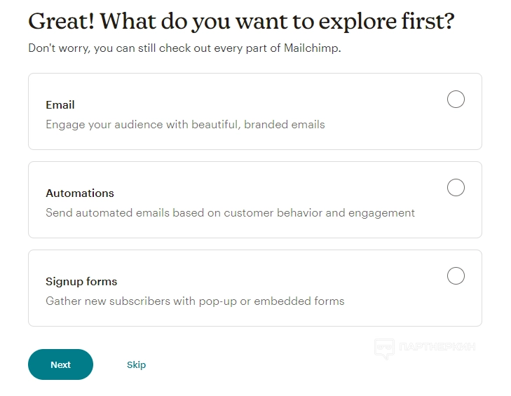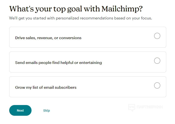 Далее сервис предложит ответить на вопрос: «Какая ваша главная цель при работе с Mailchimp?». Доступно три варианта ответа: