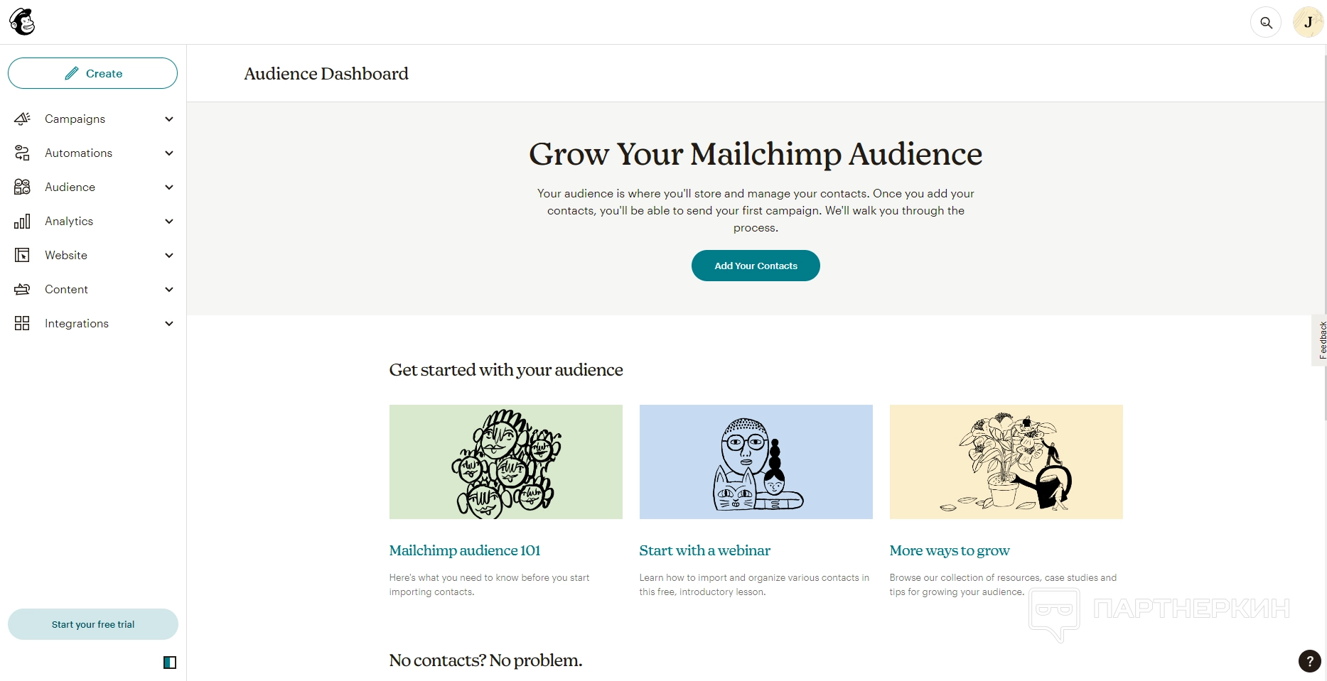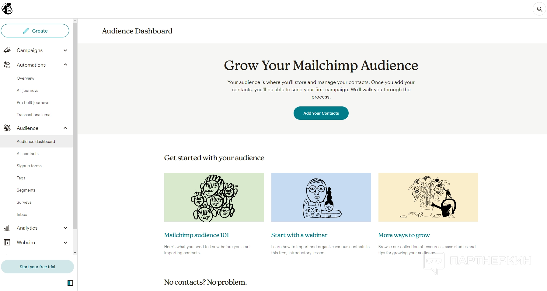 Аккаунт создан и подготовлен для работы. Теперь перейдем к обзору интерфейса Mailchimp.