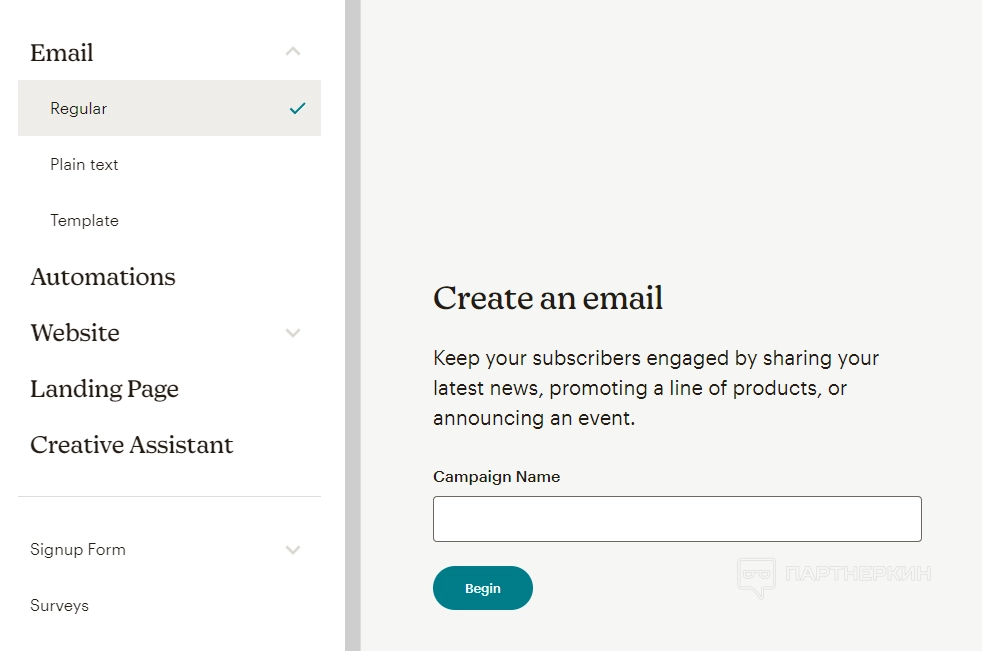 После нажатия кнопки «Create» начинается работа с сервисом. Пользователь Mailchimp может создать: