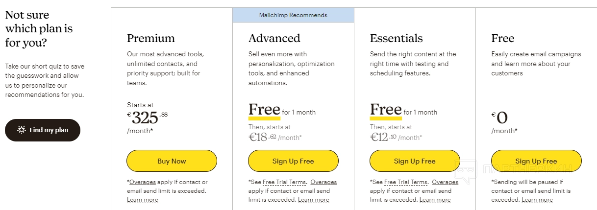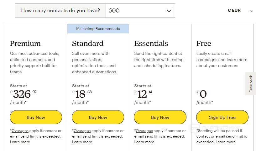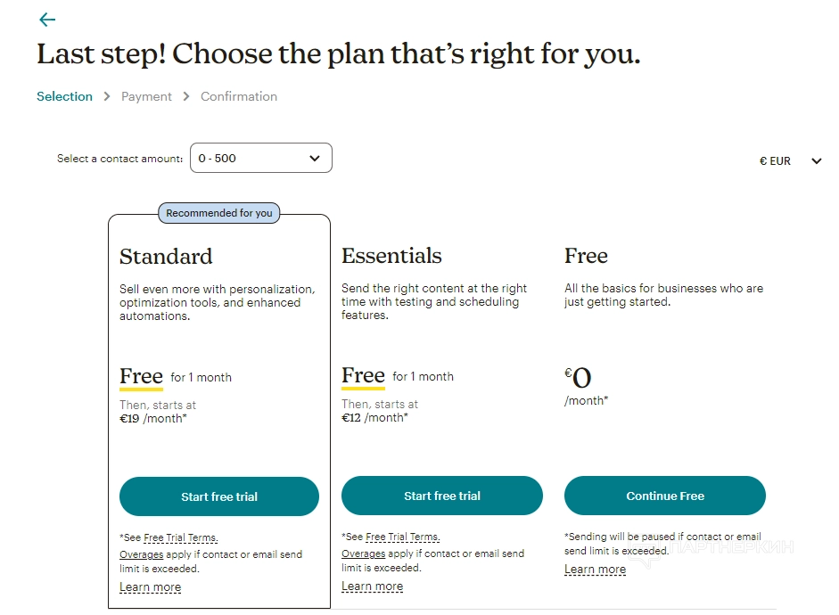 - Essentials (€ 12 в месяц). Предназначен для продвинутых пользователей с небольшой аудиторией (до 500 контактов).