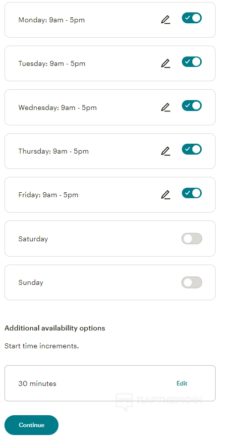 Если пользователь выбрал вариант «Лично», ему необходимо выбрать дни и время, на которые люди могут назначать свои встречи. В настройках нужно добавить интервалы в хронологическом порядке.