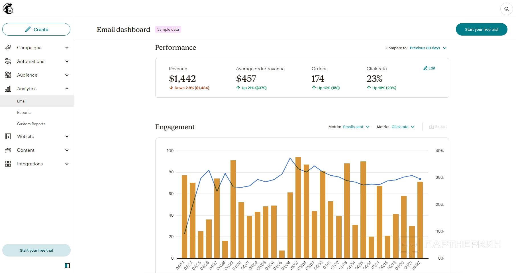 - Аналитика и отчеты. Mailchimp предоставляет детальную статистику и отчеты об эффективности рассылок. Пользователь может посмотреть количество кликов, отписок, открытий писем и другие метрики, чтобы проанализировать эффективность кампаний.