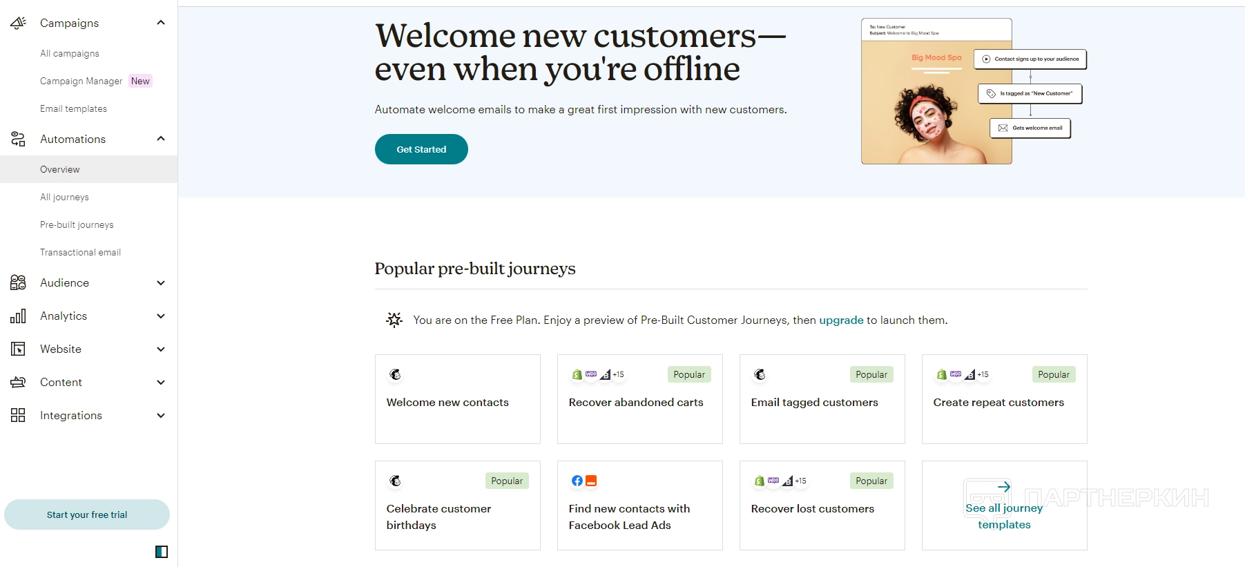 - Free (€ 0 в месяц). Подходит для новичков, которые желают ознакомиться с платформой. Пользователи могут создавать рассылки по электронной почте и больше узнают о своих клиентах.