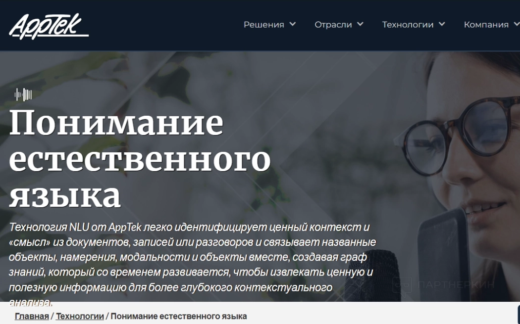 Технология AppTek NLU позволяет анализировать и определять контекст и «смысл» документов, записей или разговоров, извлекая и интерпретируя важный контекст с использованием технологий нейронной сети и машинного обучения. Эта функция позволяет пользователям понимать документы и разговоры на более глубоком уровне и получать более точные результаты.