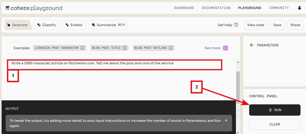 Окно для генерации текста выглядит следующим образом. В основное поле добавляют ТЗ (1). После нажатие на кнопку RUN (2) система начинает формировать текст.