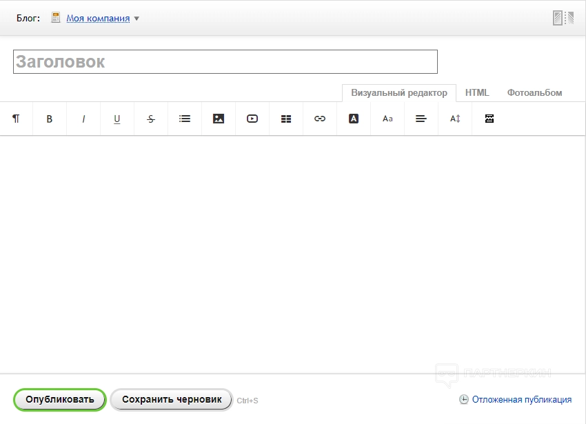 Пользователь может создать блог. Для этого на странице необходимо нажать «Создать запись», указать заголовок, ввести текст и кликнуть «Опубликовать» (или «Сохранить в черновик»).