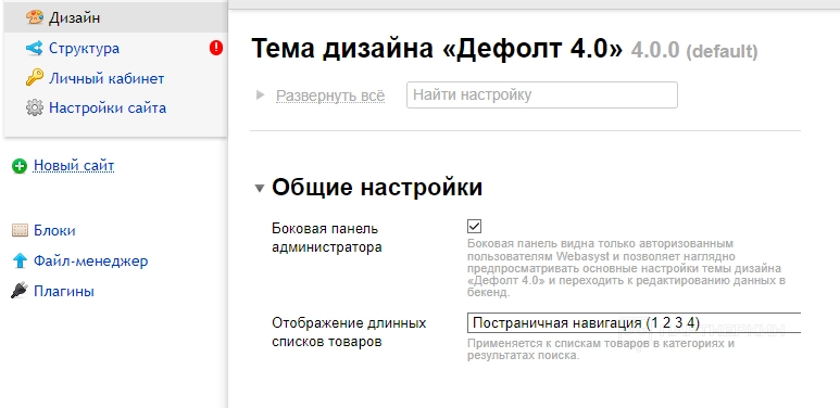 - Боковая панель администратора. Видна только авторизованным пользователям Webasyst и позволяет наглядно продемонстрировать основные настройки темы дизайна «Дефолт 4.0» и переходить к редактированию данных в бекенд.