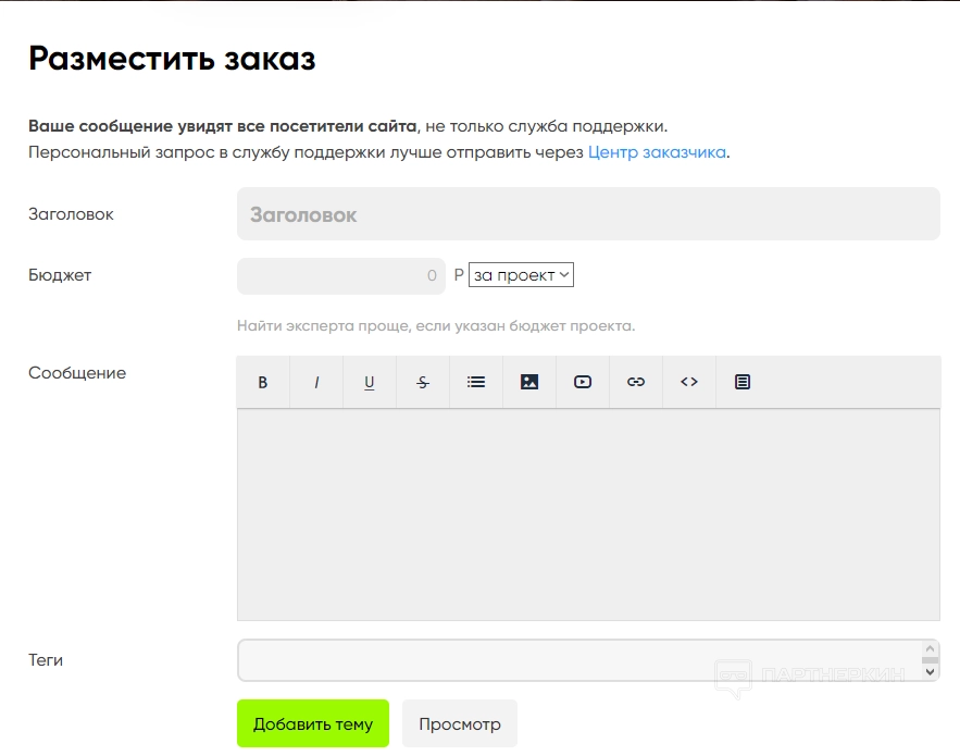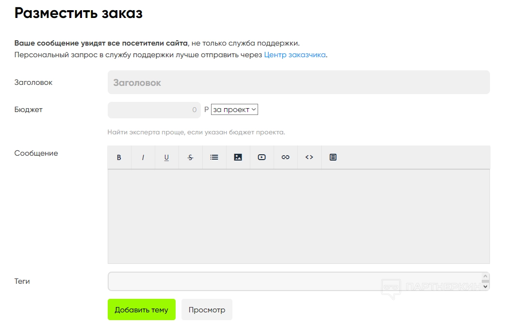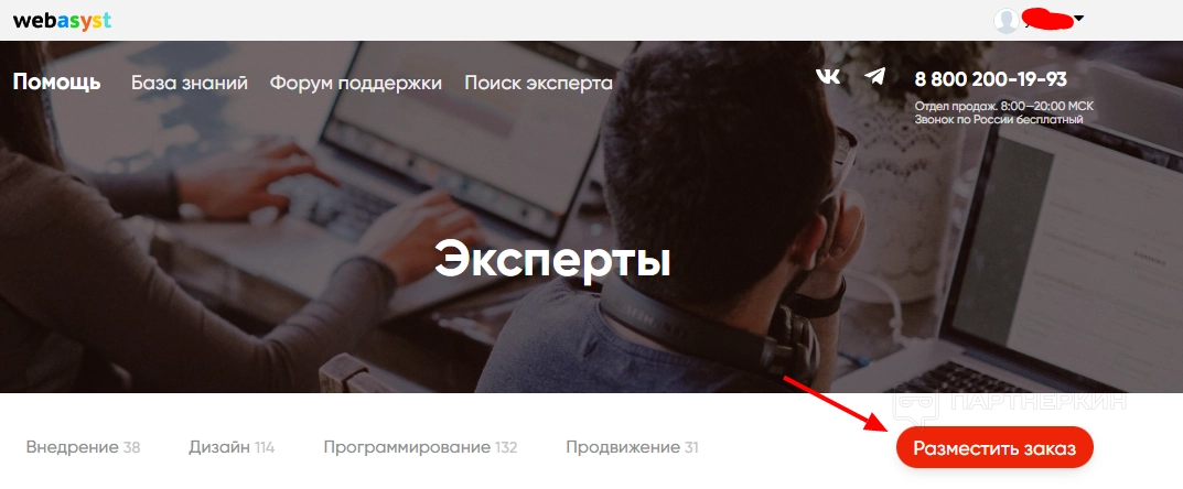 Откликнуться на заказ могут только зарегистрированные эксперты Webasyst. У пользователей платформы также есть возможность разместить задание. Для этого нужно выбрать «Разместить заказ» и заполнить аналогичную форму, как при поиске экспертов.