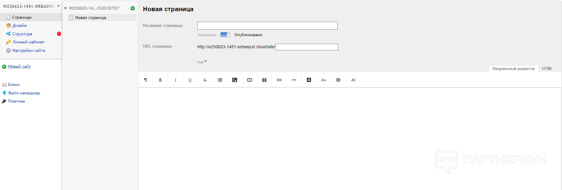 В этом разделе пользователь может добавить название страницы, URL и работать с визуальным редактором.