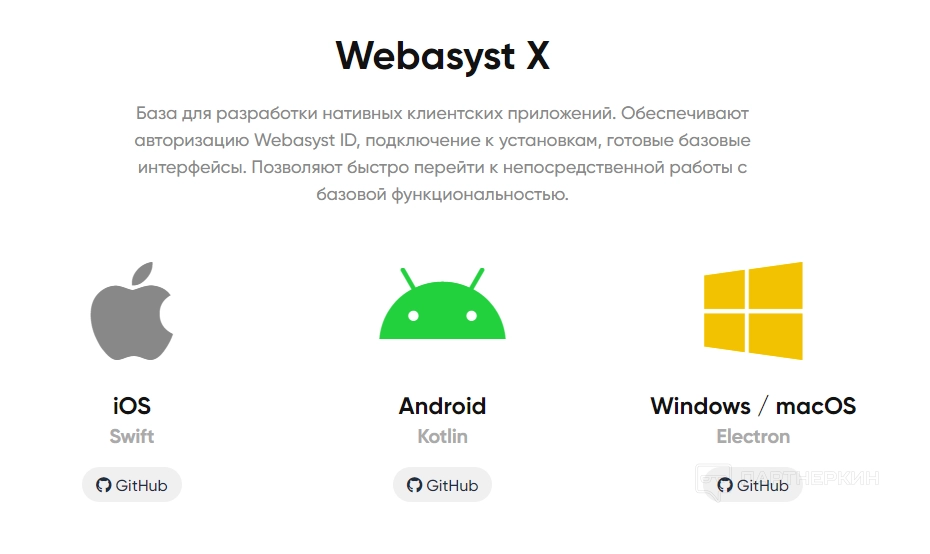- Webasyst X . База для разработки нативных клиентских приложений. Позволяет быстро перейти к работе с базовой функциональностью. Можно установить на iOS, Android, Windows и MacOS.