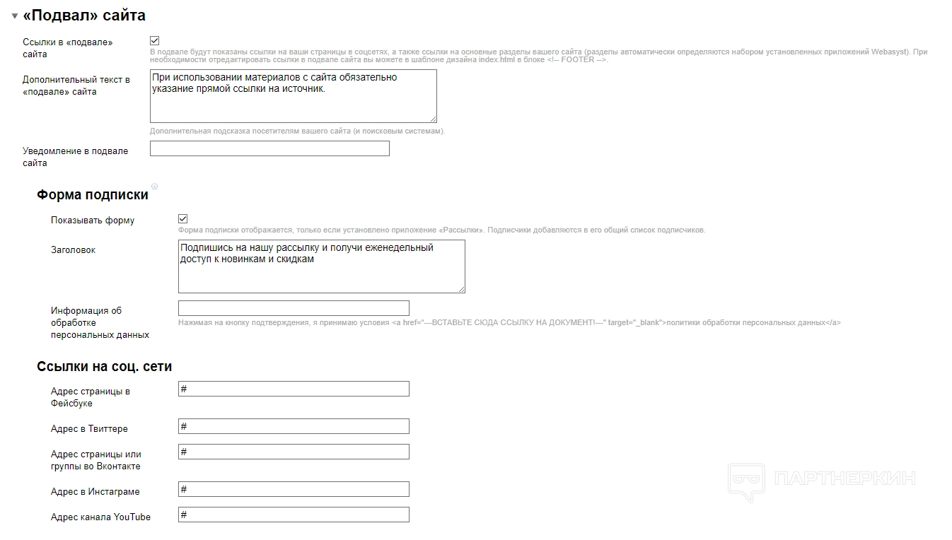 - ссылки в «подвале» сайта (будут показаны ссылки на страницы пользователя или компании в социальных сетях, а также основные раздела веб-ресурса. Разделы автоматически определяются набором установленных приложений Webasyst);