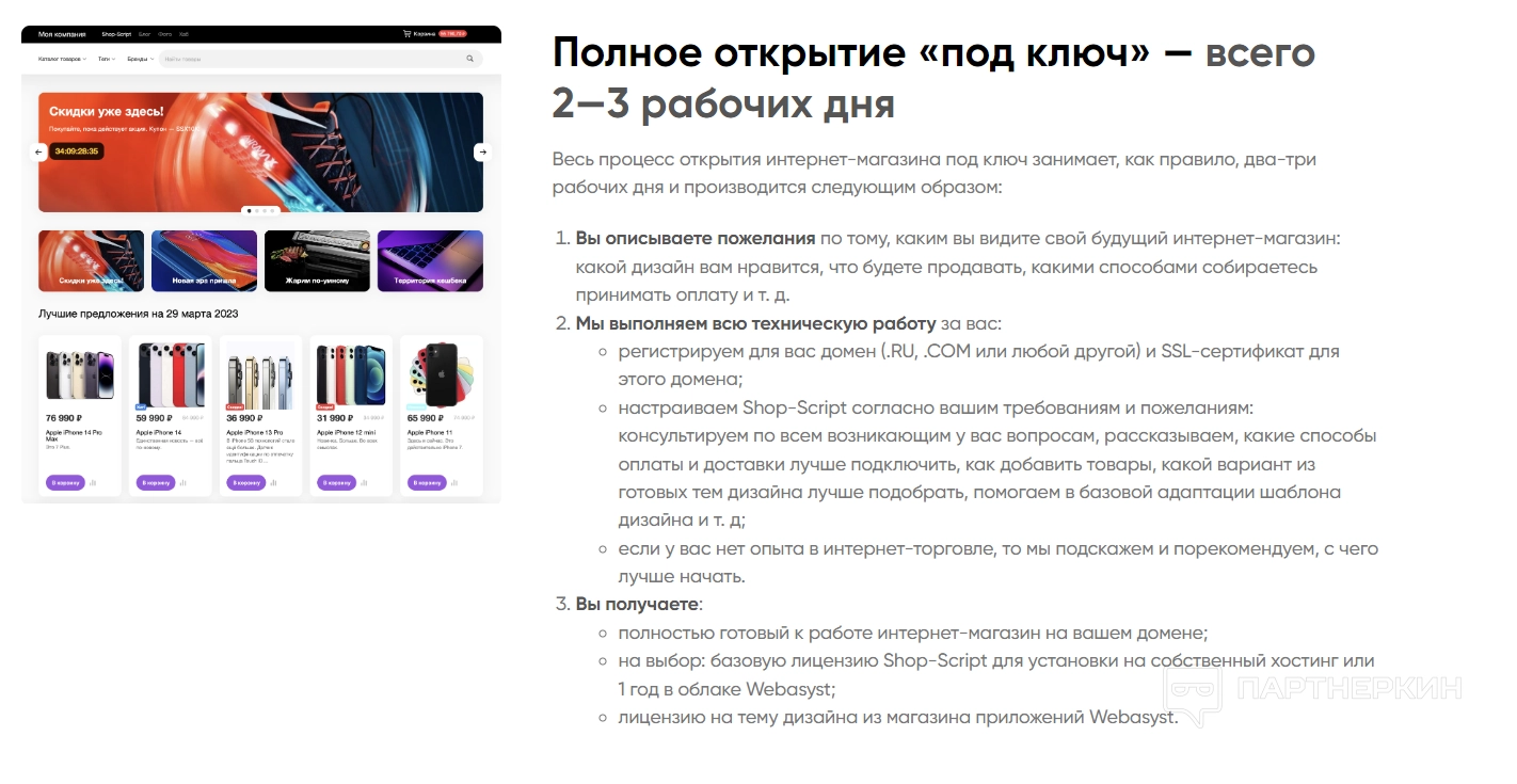 - на выбор: базовую версию лицензии Shop-Script для установки на собственный хостинг или один год в облаке Webasyst на тарифе Стартап.