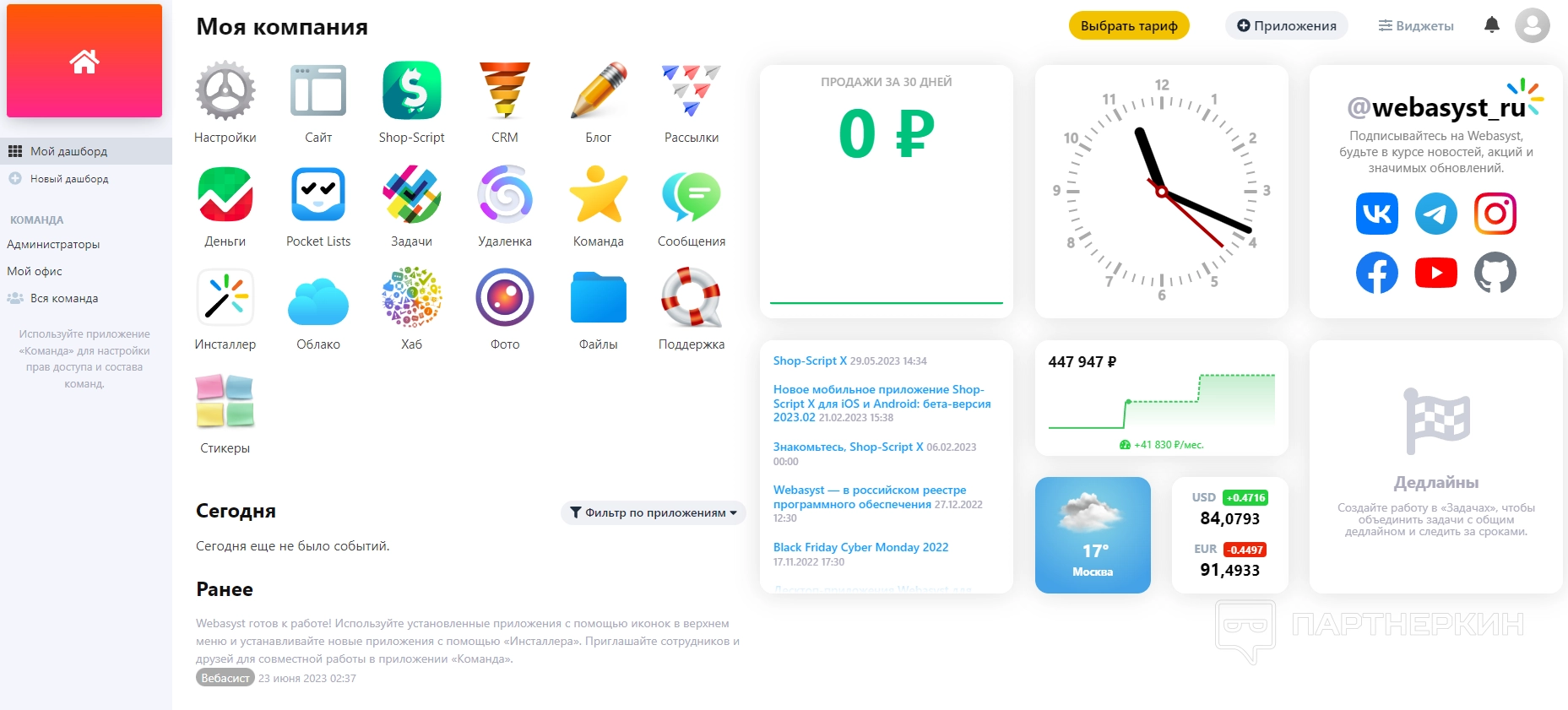 | Персональные дашборды | Специалисты могут настроить свой собственный стартовый экран Webasyst и добавить на него нужные элементы — виджеты с ключевыми показателями бизнеса, приложения, ленту событий и другое |