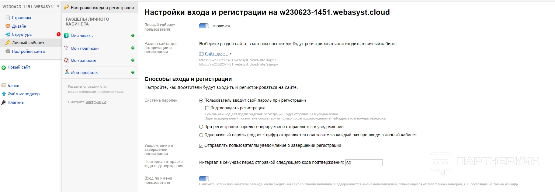 В настройках личного кабинета можно настроить способы входа и регистрации, адрес электронной почты. Примеры разделов личного кабинета (они определяются подключенными приложениями):