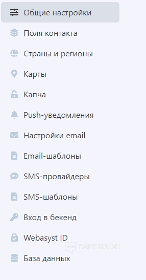Здесь можно настроить поля контакта, страны и регионы, карты, push-уведомления, SMS-шаблоны и многое другое.
