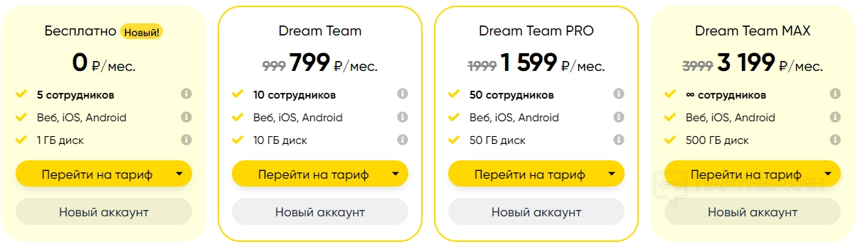 | Доступ к истории | Срок доступа и хранения данных на бесплатном тарифе ограничен 3 месяцами, на Dream Team — 3 года. На остальных не ограничен |