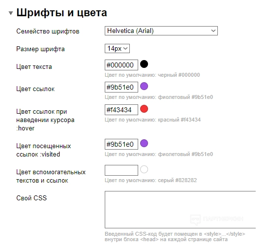 - название сайта в верхнем меню (необходимо выключить функцию, если пользователь не хочет, чтобы название сайта показывалось в верхнем меню разделов сайта. Если загружен логотип веб-ресурса, то эта настройка действовать не будет);