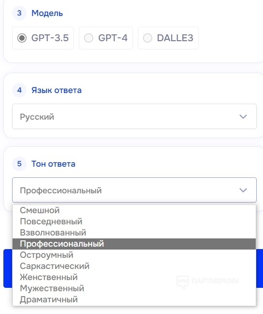 - При необходимости внести дополнительные настройки. Например, можно выбрать язык, tone-of-voice.