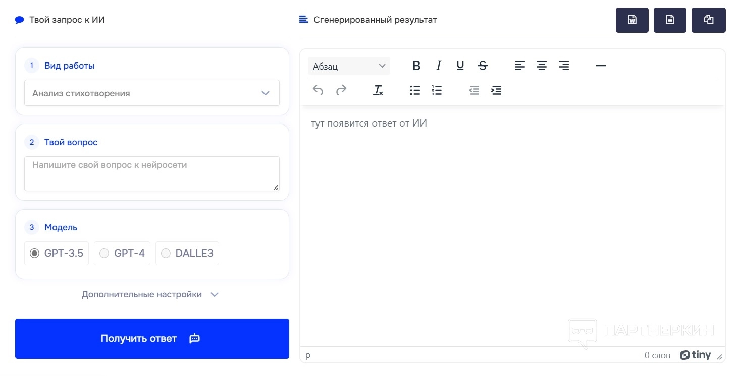 - Технология GPT. В работе сервис использует нейросеть GPT-3.5 и 4 для высокого качества генерации.