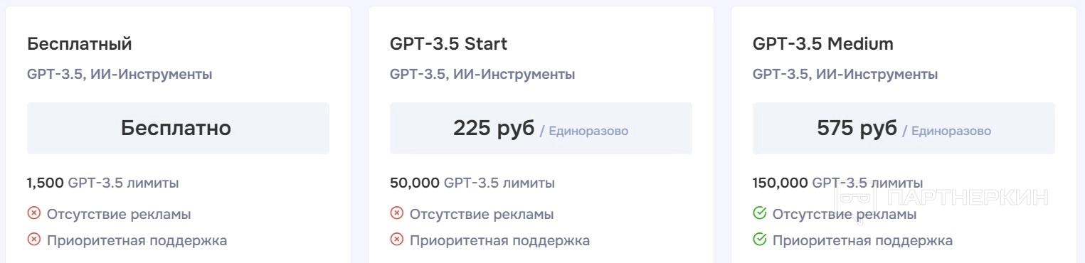 - GPT-3.5 Medium — тариф за 575 руб / единоразово. Включает 150,000 GPT-3.5 лимиты.