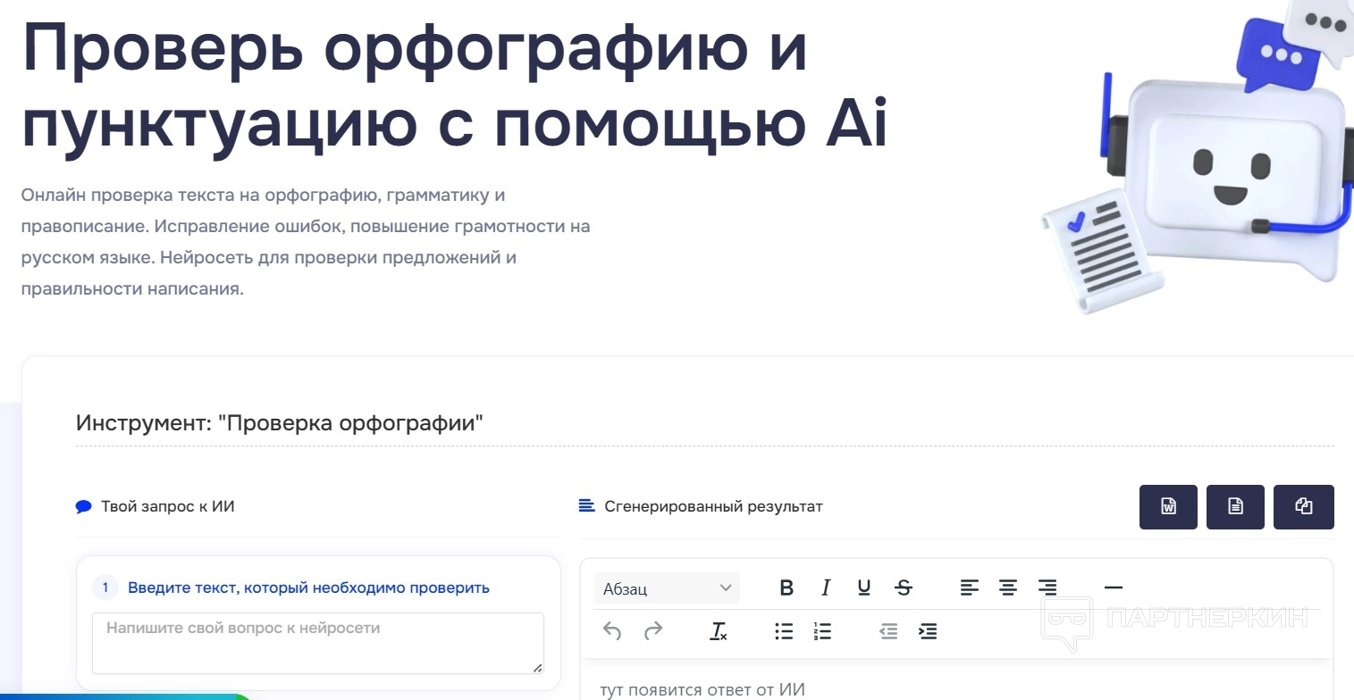 Чтобы воспользоваться этой функцией, нужно ввести текст, который требуется проверить, задать вопрос нейросети. Отдельно есть опция Проверка английского текста, которая сможет проверить орфографию на английском.