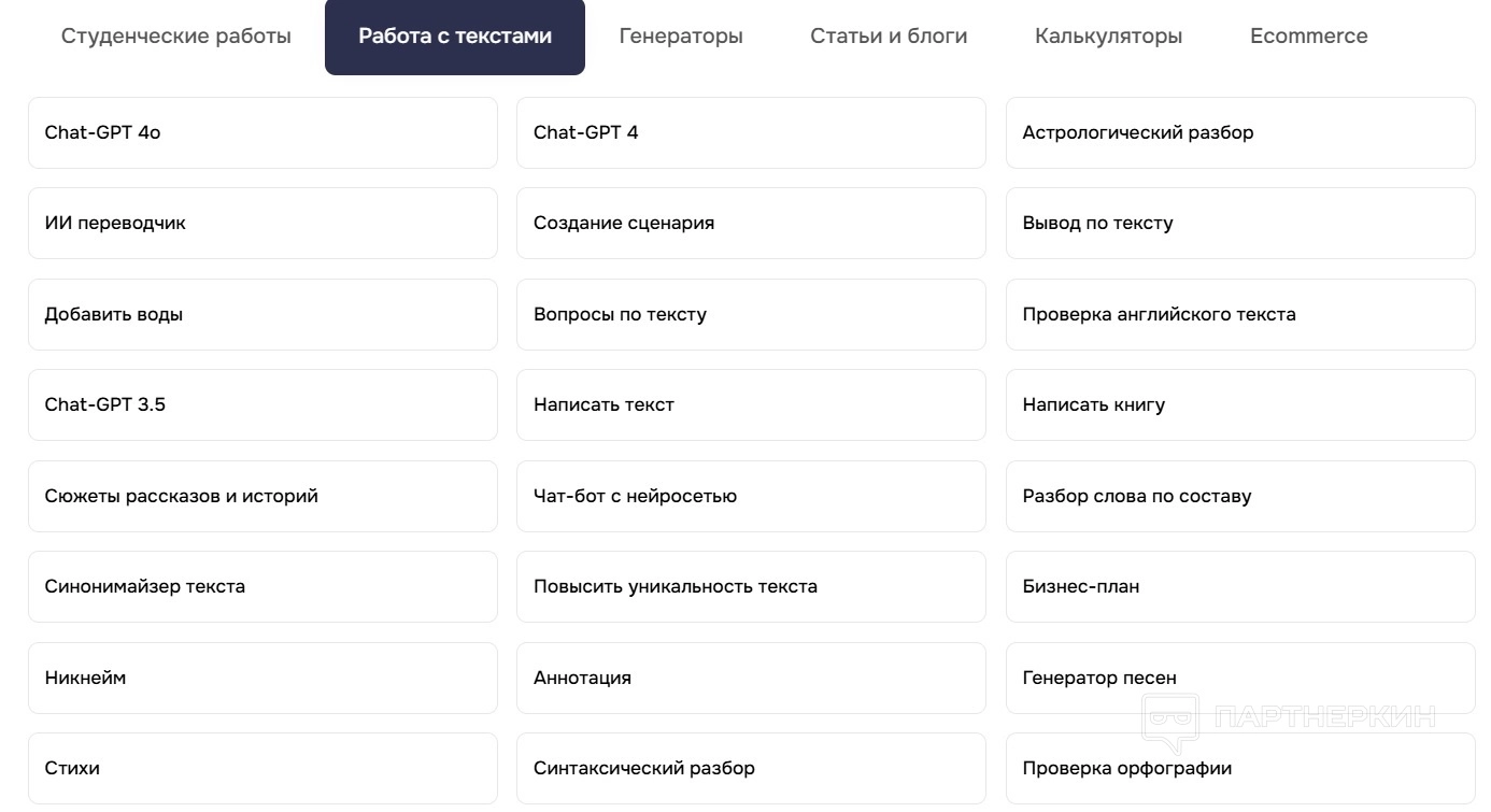 Есть отдельно опции для работы с текстами — редактирование, преобразование, анализ, вычленение главного.