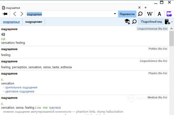 Как видно из скриншота, предоставляется не только перевод слова, но и объясняется его значение. Также предоставляются примеры употребления слова в зависимости от их контекста. Например, некоторые слова могут иметь разные значения в медицинской или технической сфере.