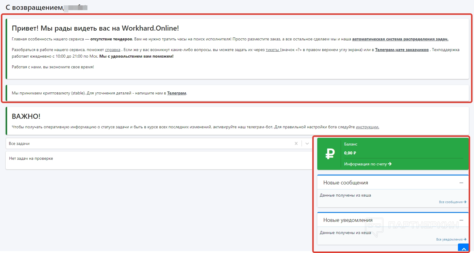 После завершения регистрации пользователь попадет на стартовую страницу личного кабинета, где отобразятся последние новости, приветствие и текущий баланс. Также на главной можно найти последние сообщения и уведомления.