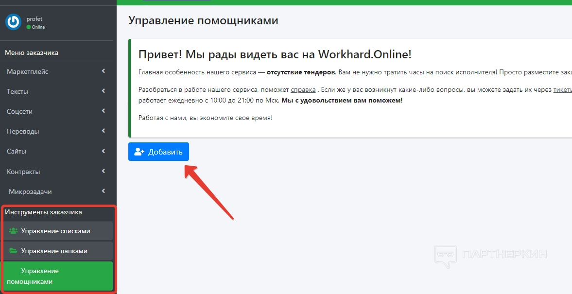 Также в панели управления есть дополнительные инструменты. Например, «Управление списками» позволяет создавать заказчику черные и белые списки исполнителей. В «Управление папками» можно создавать разные папки, в которых будут храниться заказы или выполненные работы. Во вкладке «Управление помощниками» владелец аккаунта может добавить пользователя, которому выдаст доступ к управлению.