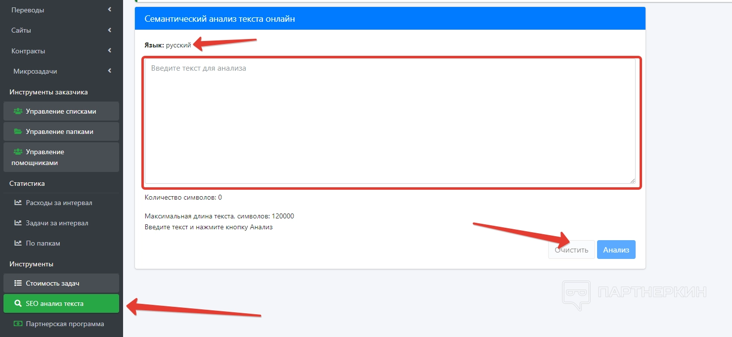 Также есть вкладка «SEO анализ текста», где можно проводить семантический анализ статей объемом до 120 000 символов. Для этого нужно выставить текст в соответствующее окно, выбрать язык и нажать на кнопку проверки.