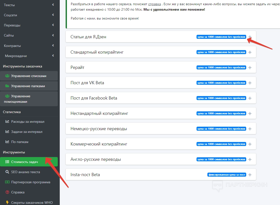 В нижней части панели управления есть еще вкладки с дополнительными инструментами. Например, во вкладке «Стоимость задач» вебмастер может ознакомиться с ценами статьей, постов в социальные сети и переводов. Достаточно просто выбрать нужный вариант и нажать на «Цена за 1 000 символов без пробелов». Откроется список со стоимостью работ по разным направлениям.