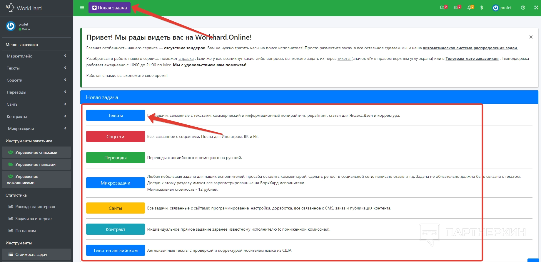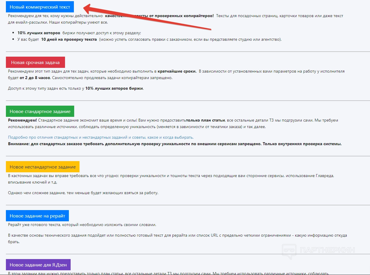 Для оформления заказа поднимаемся в верхнюю часть экрана и жмем на кнопку «Новая задача». Далее выбираем тип задачи. Например, «Тексты».