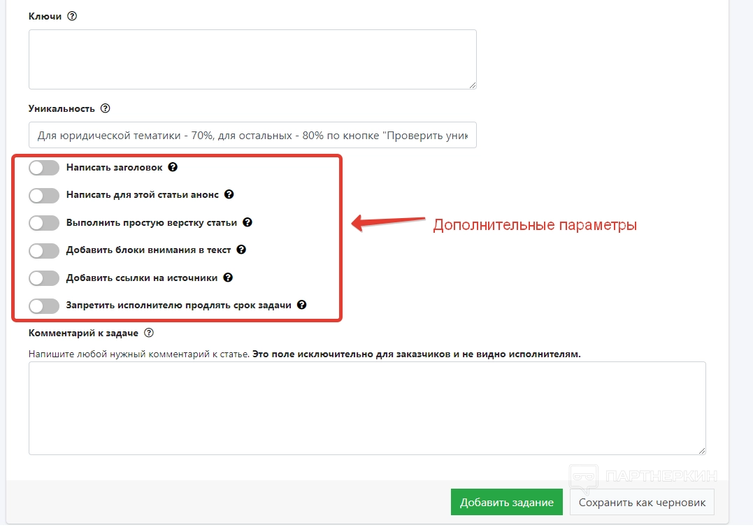 С помощью текстового редактора создаем описание технического задания и вставляем ключевые слова. По завершении нужно указать уникальность и оставить комментарии. Также можно настроить дополнительные параметры. После этого жмем на «Добавить задание».