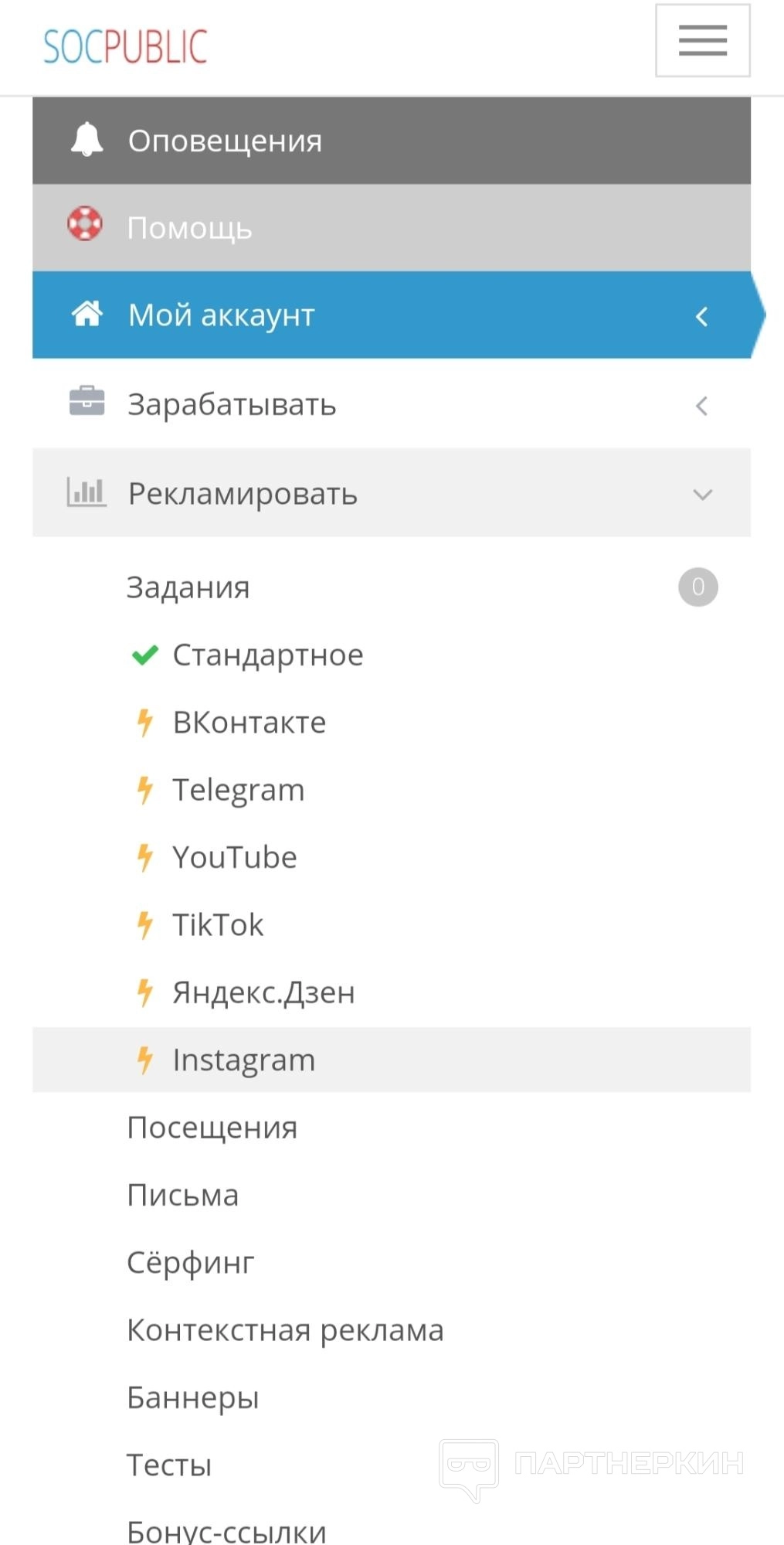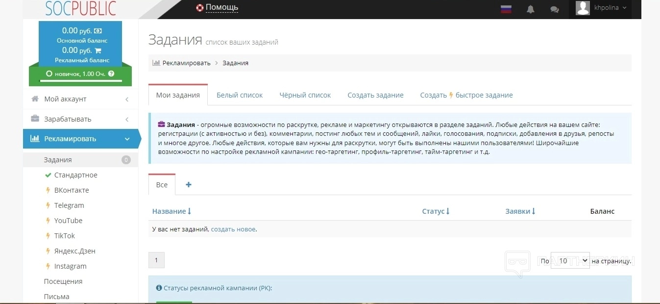 - Рекламировать — раздел для работы в статусе заказчика. Можно создавать стандартные задания или быстрые (разграничены по определенным социальным сетям и площадкам), а также просматривать статистику их выполнения исполнителями, составлять свои белые и черные списки и многое другое.