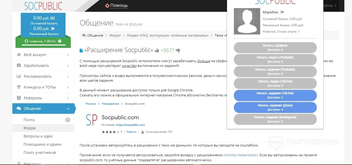 Затем понадобится пройти авторизацию и перед пользователем откроется окошко расширения, в котором будут отображаться все доступные варианты заработка.