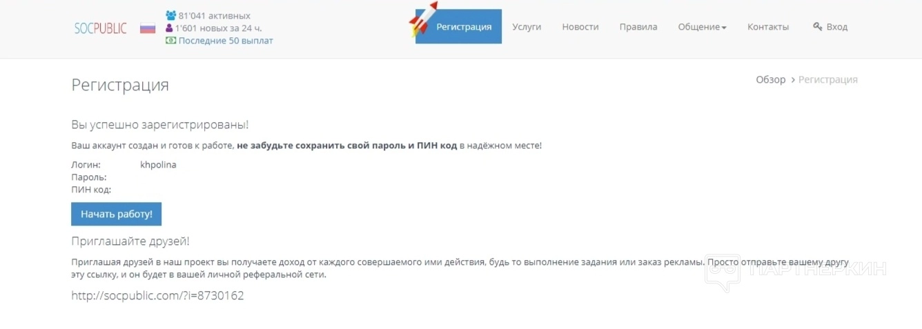 Перед этим сервис поприветствует нового пользователя и еще раз продублирует все необходимые для входа в систему данные, включая уникальный ПИН-код. Последний может понадобиться в качестве дополнительного помощника при восстановлении доступа в кабинет, если был забыт пароль.