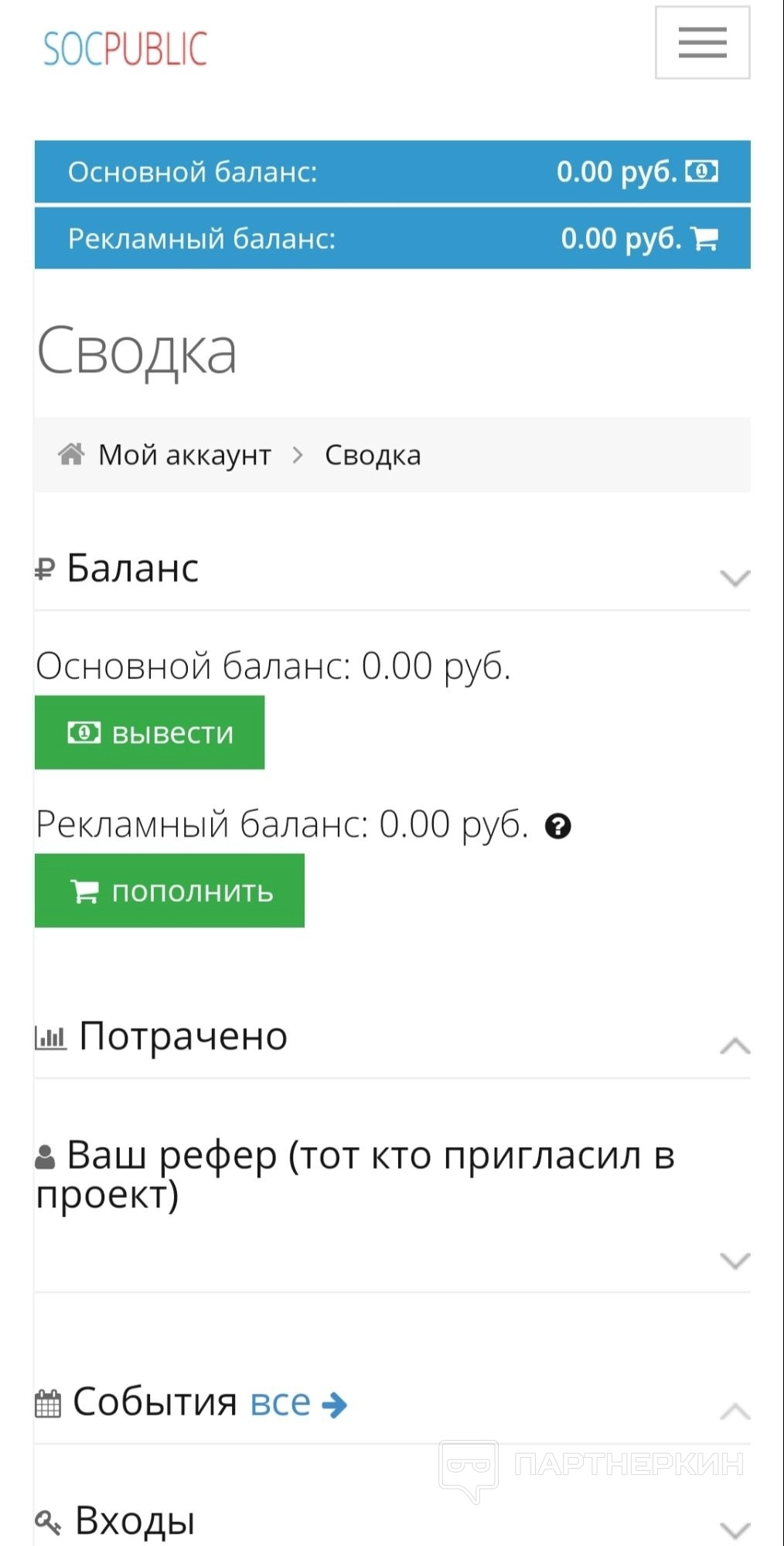 На главном экране находится основная информация по сводке профиля: баланс кабинета, история операций, информация о рефере, события и так далее.