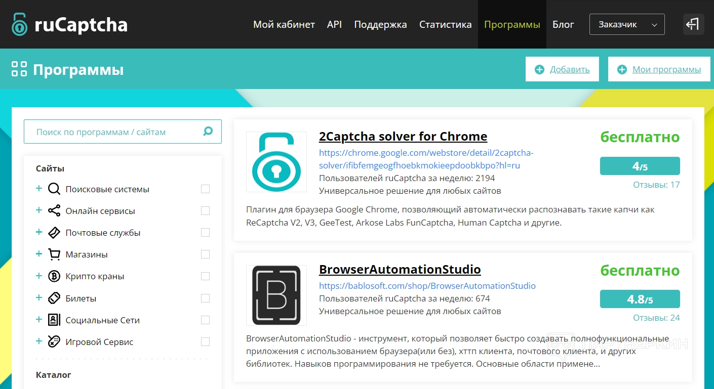 В целом, сильной разницы в интерфейсе не наблюдается — нет дополнительных методов заработка и программного обеспечения, но зато можно автоматически подключить API для решения капч. Для этого достаточно перейти в «Программы» и выбрать подходящее решение.