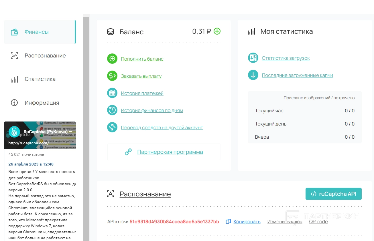 - Блог — основная информация по новостям сервиса, актуальной стоимости капчи для заказчика и исполнителя, а также среднее время работы платформы по одному ключу.