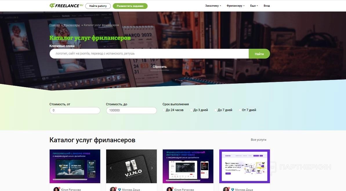 Исполнители могут брать в работе готовые проекты либо выставить собственные услуги в соответствующий каталог. В этом случае фрилансер сам выставляет расценки за свою работу и уточняет условия выполнения заказа.