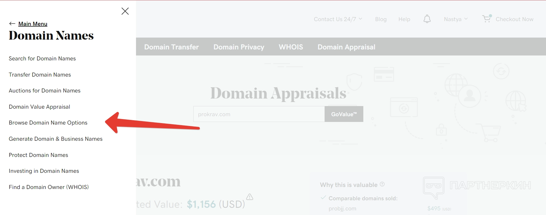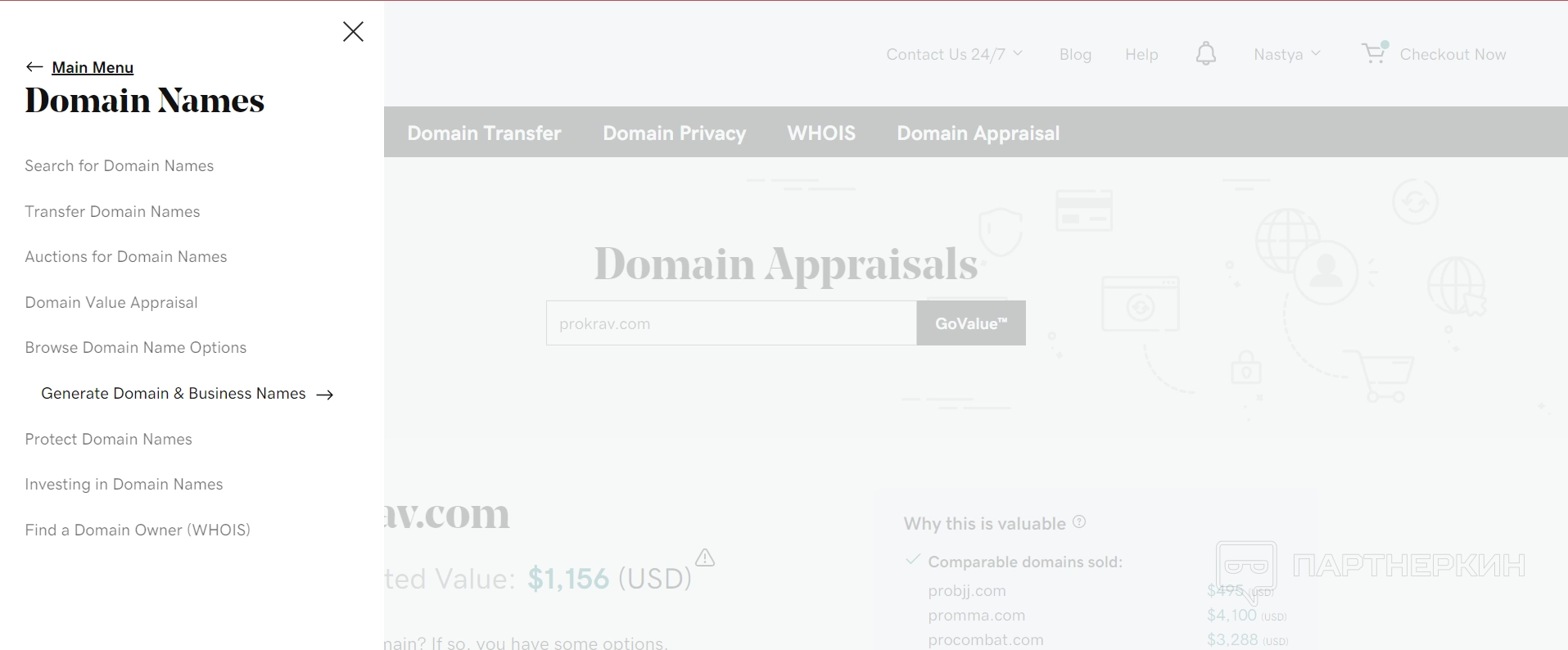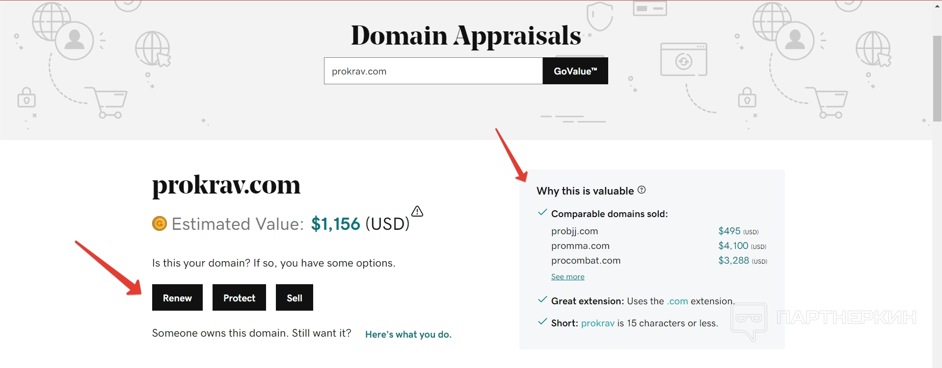 В выдаче откроется сама стоимость домена, а также причины, по которым он окажется хорошим вложением — оценивают зону домена, сопоставимые домены, а также его длину. Кроме того, если анализируется стоимость домена пользователя, то он может продлить его оплату, защитить от выкупа или продать. Отображение в этом меню может означать, что вышел срок оплаты домена, и он автоматически ушел на продажу.