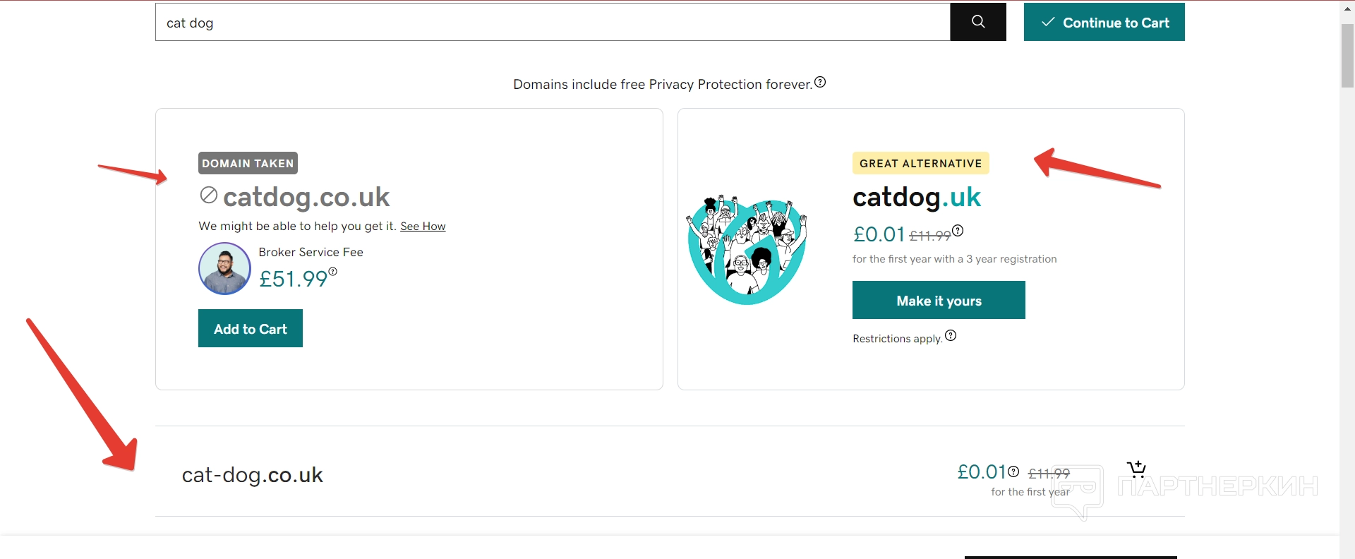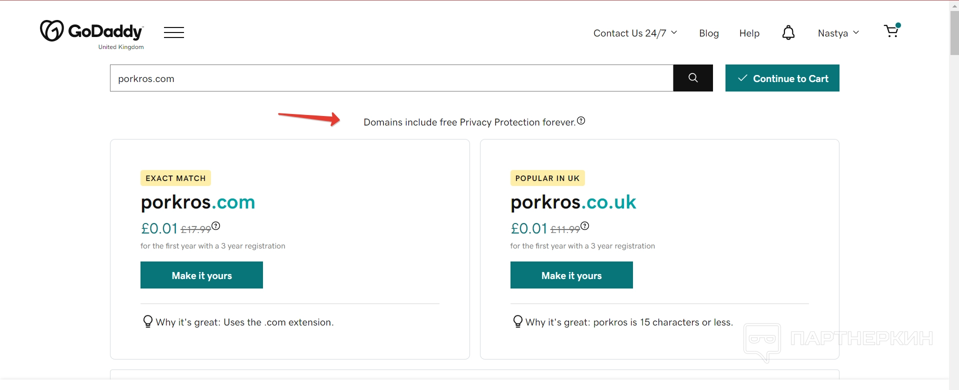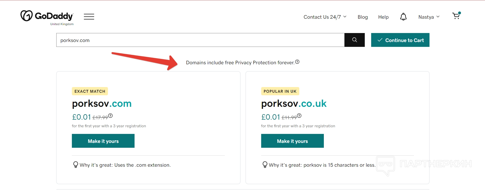 В списке показываются все варианты доменов с похожим или указанным названием, а также их стоимость и почему они будут эффективным. При этом каждому домену при заказе предлагают бесплатно обеспечить защиту конфиденциальности.