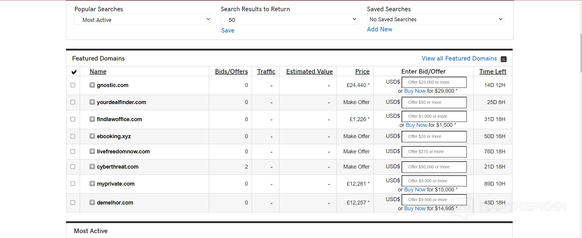 Все домены распределены в таблице по популярности — в ней указывается само название домена, количество заявок на покупку, расчетная стоимость, изменения в позициях, а также стоимость, ставка и количество дней, в течение которых домен будет продаваться.