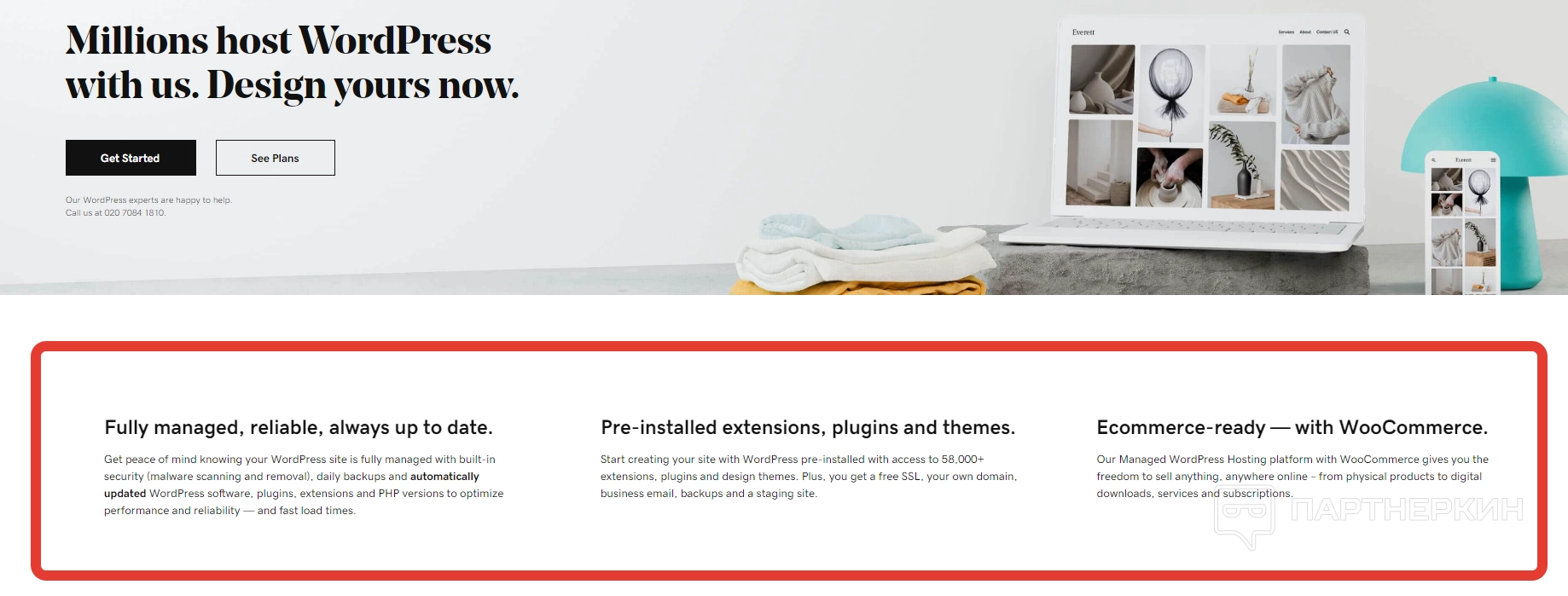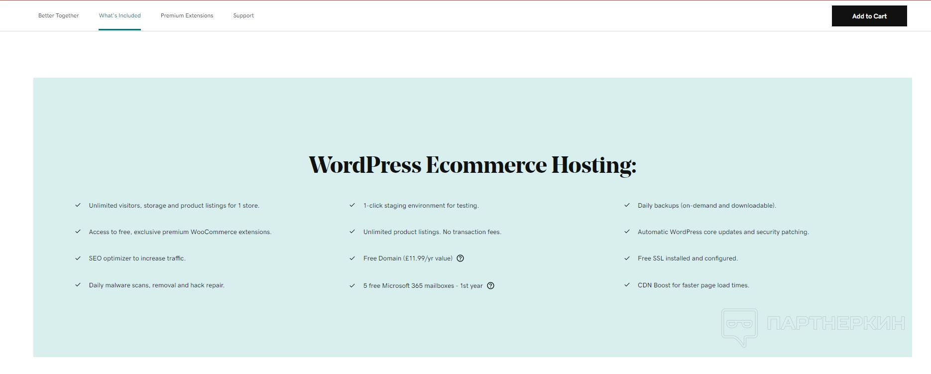 Wordpress eCommerce Хостинг — платформа предлагает и хостинг для онлайн-магазинов, чтобы быстро подключить их к WooCommerce и использовать все его преимущества. Например, пользователи получают множество плагинов для аналитики, поиска вредоносных программ или улучшения визуала сайта.