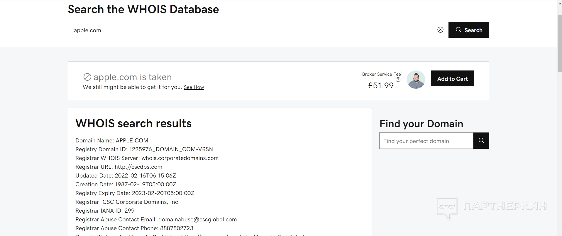 Для поиска пользователь просто вбивает домен и получает данные — всю информацию о домене и его владельце, а также предложение о перекупе. Здесь же можно вбить собственный домен, чтобы посмотреть, какие данные отображаются в каталоге и по необходимости скорректировать их.